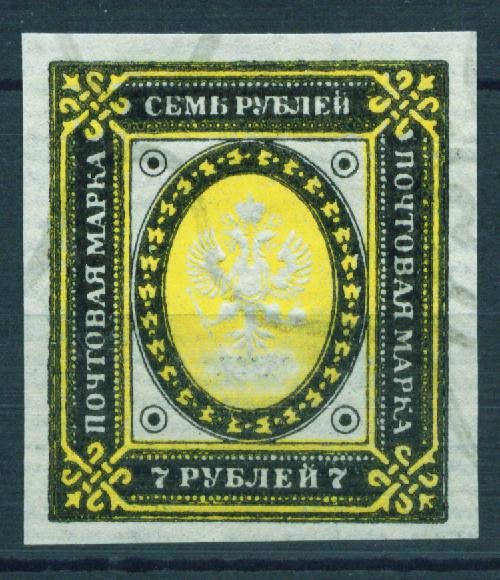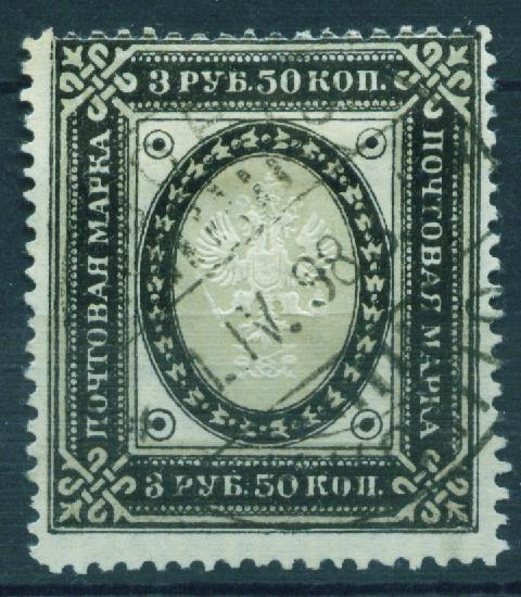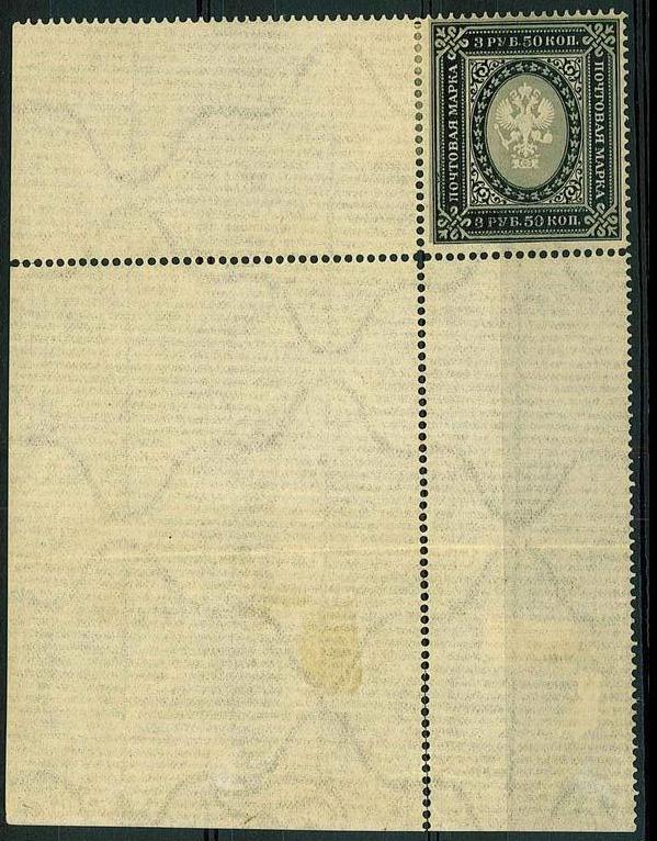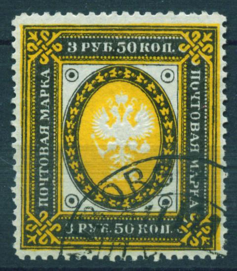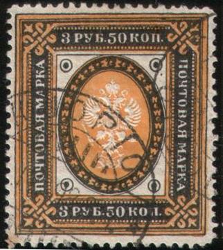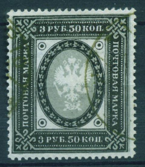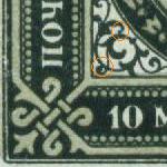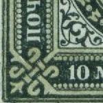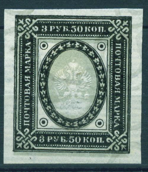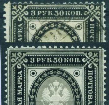 Fournier stamp imperforated and without postmark. 3,50 Rbl Ringtype ![]() On top a Fournier and below a genuine stamp. Note the position of the upper left ring, the single frameline and the blurred pearls of the fake.
