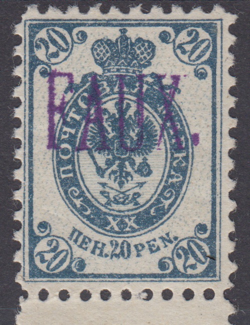 Fake stamps from Russian periodE. A. Majlund's Postal forgery of 20p stamp from 1904 - perforated 11½Ephraim Alexander Majlund (1871-1935) produced these fake stamps in Tampere. His intention was to sell them to the public. He was revealed and convicted for the fraud in August 1904 and was sentenced to two years of imprisonment.Authorities confiscated nearly 6.000pc of the stamps. Only very few cancelled copies are known, none of type I, and no postal items are known.